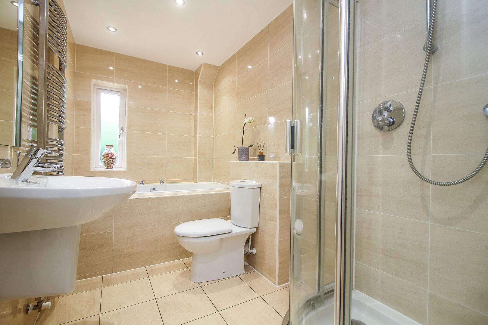 Upstairs, the principal bedroom features a custom walk-in wardrobe and a sleek en-suite shower room. Three further spacious double bedrooms are offered, two of which share a modern Jack-and-Jill en-suite, alongside a stylish family bathroom.