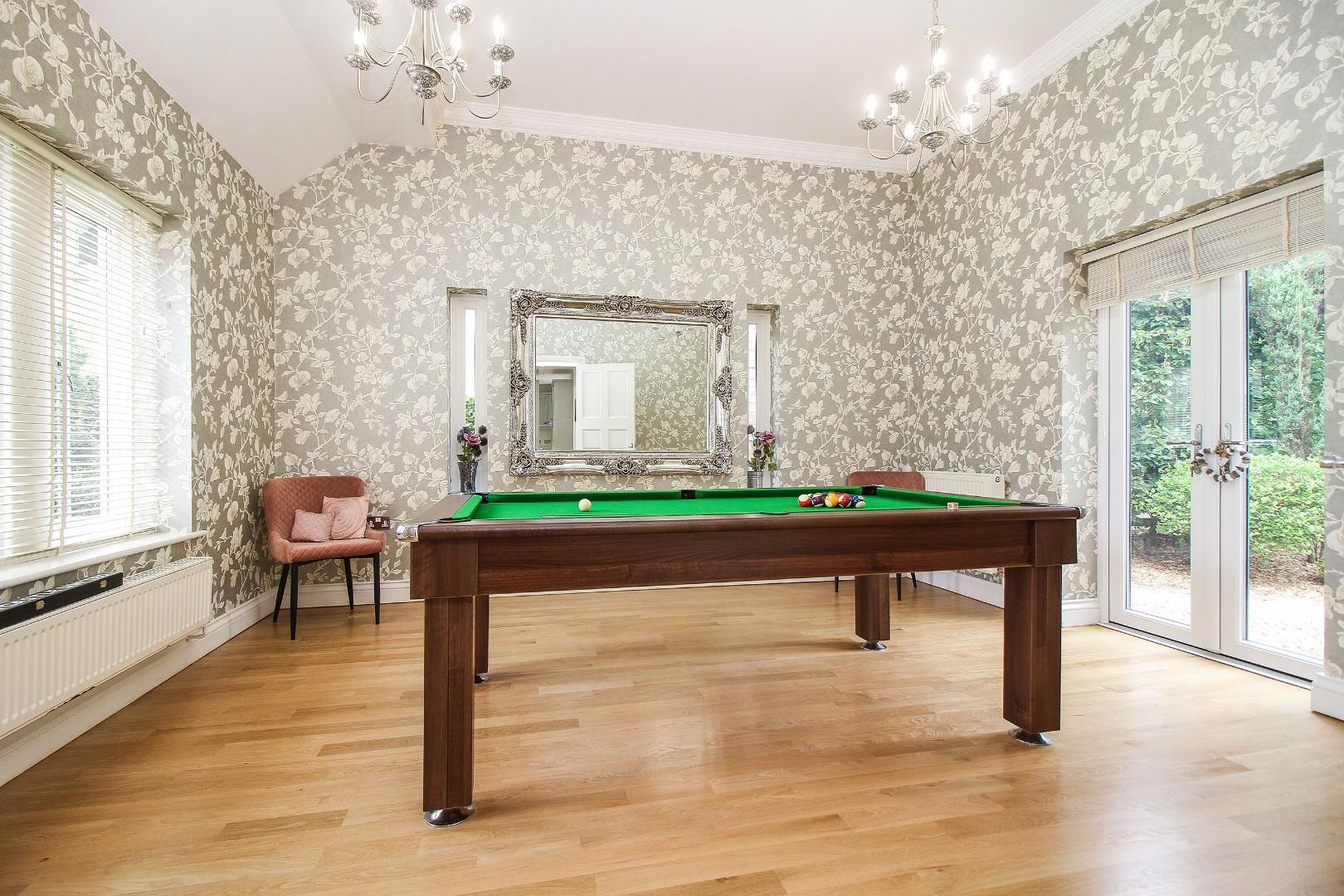 Beyond the kitchen, a generous second reception room—currently used as a games room—offers flexible living space. The ground floor also includes a home office, a separate utility room, and internal access to the double garage.