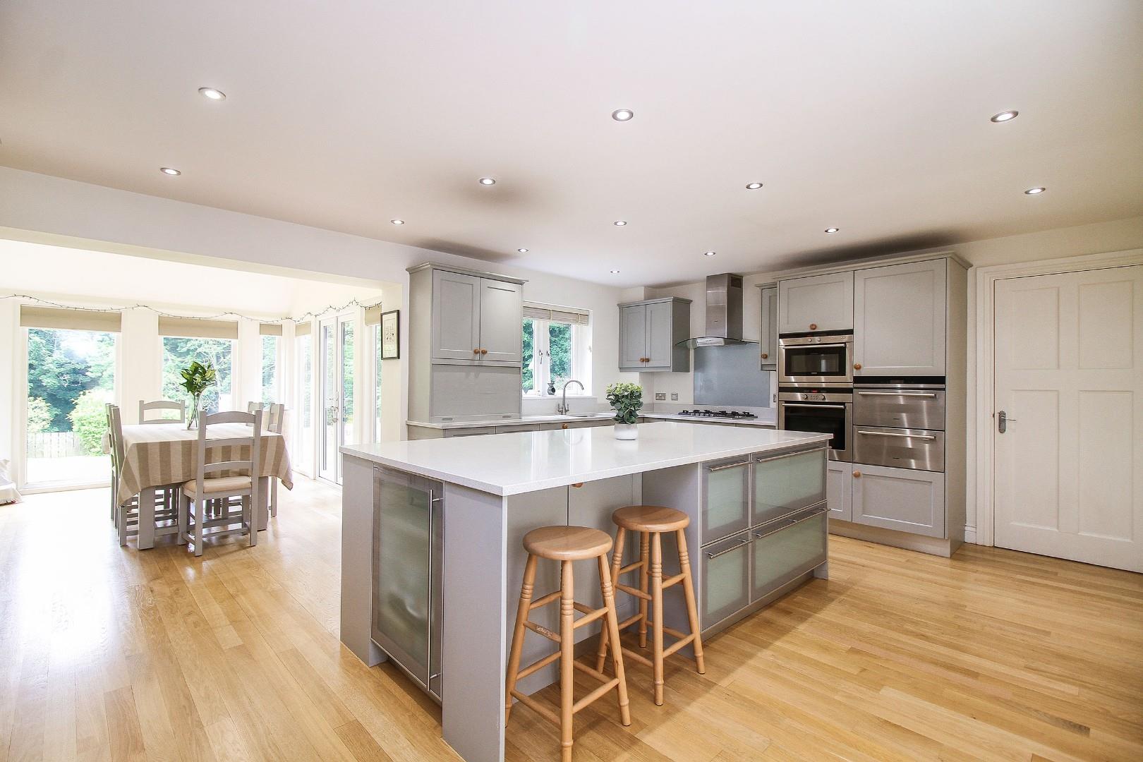 The kitchen is the heart of the home, fitted with classic shaker-style wall and base units, integrated appliances, and a large central island ideal for entertaining. There’s also a dedicated dining area with French doors opening directly onto the garden.