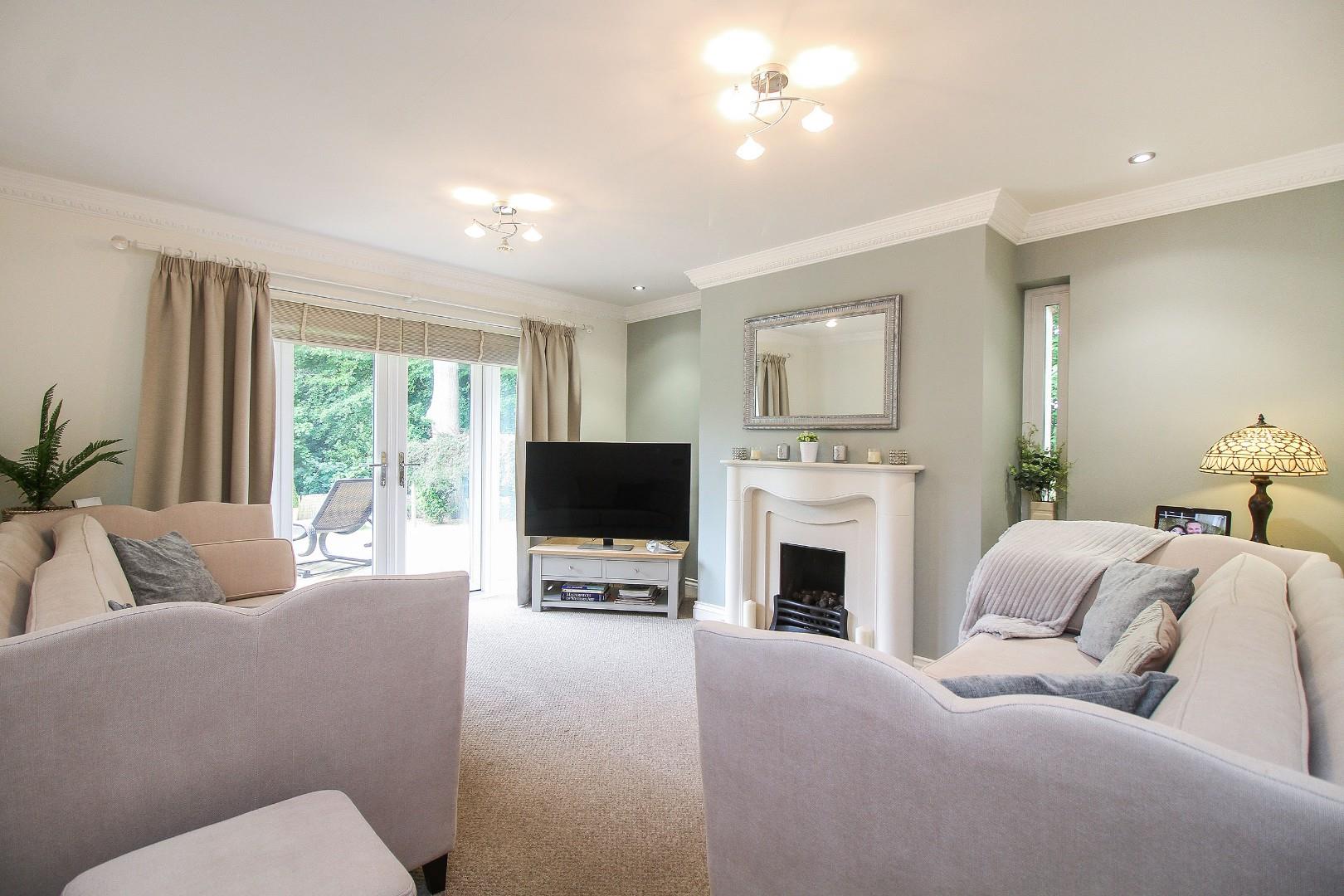 Step inside to a welcoming entrance hall with a W.C, stairs to the first floor, and access to the principal ground floor rooms. The formal living room is bathed in natural light from multiple windows and French doors, complemented by a stylish feature fireplace, contemporary décor, and ample space for furnishings.