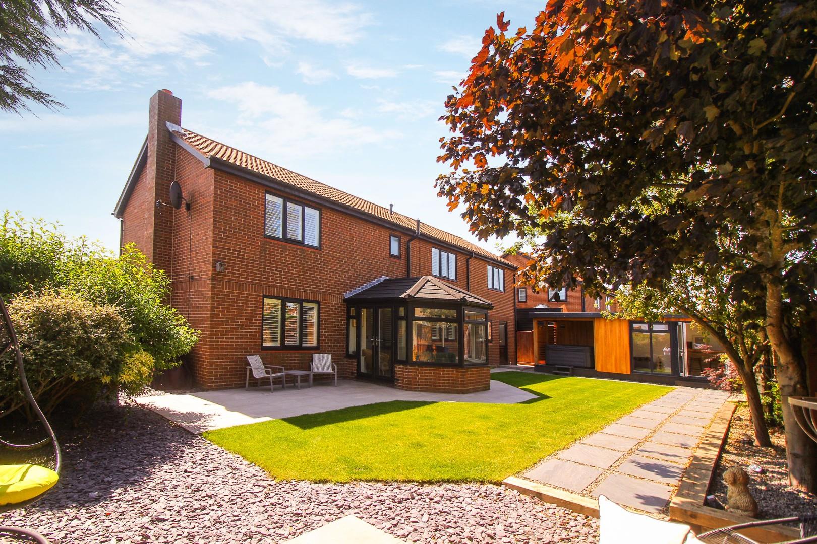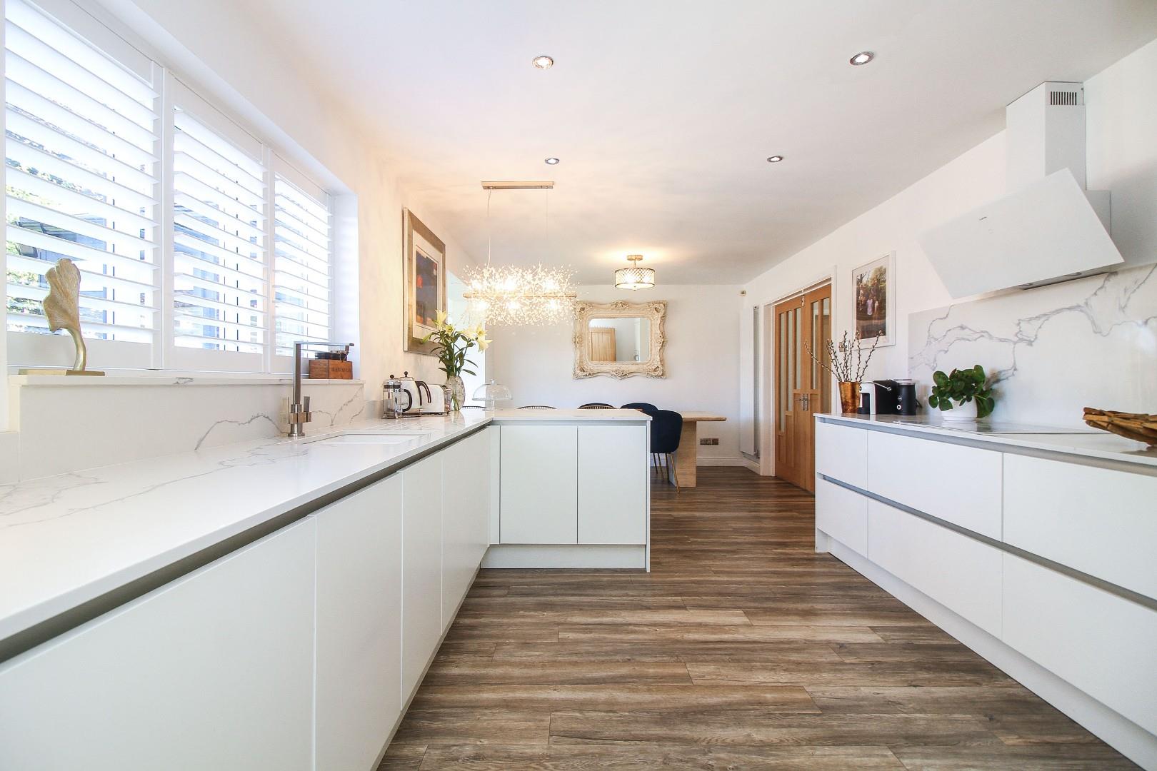 The heart of the home is the impressive kitchen/diner, complete with sleek white wall and base units, a range of integrated appliances including a fridge, oven, and induction hob, and ample space for a large family dining table. An open archway leads into a bright conservatory, ideal for relaxing while overlooking the garden. A well-equipped utility room adds convenience with extra storage and an integrated fridge/freezer.